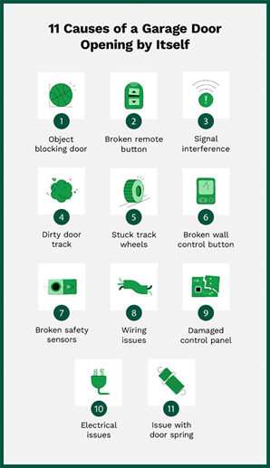 Common reasons your garage door opens by itself include a broken remote, malfunctioning sensors, or electrical issues. Due to the hazards and risks involved in repairing garage doors, always call a professional to address the source of the issue.